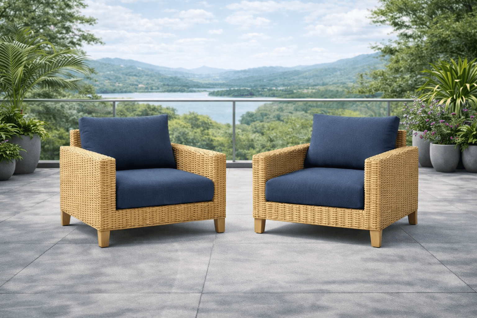 This wicker lounge chair set includes two armchairs with removable navy cushions.